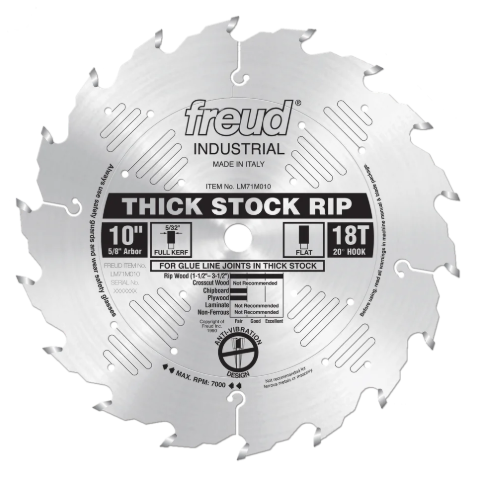 This blade is ideal for high-speed ripping operations in hardwood and softwood. The low tooth count also makes this blade ideal for ripping thick material. It can be used with manual feeding as well as with power feeders in single or gang-ripping operations. The ideal working range is 1-1/2" to 3-1/2" thick. Thinner or thicker material may be cut, but some loss of surface finish may occur.