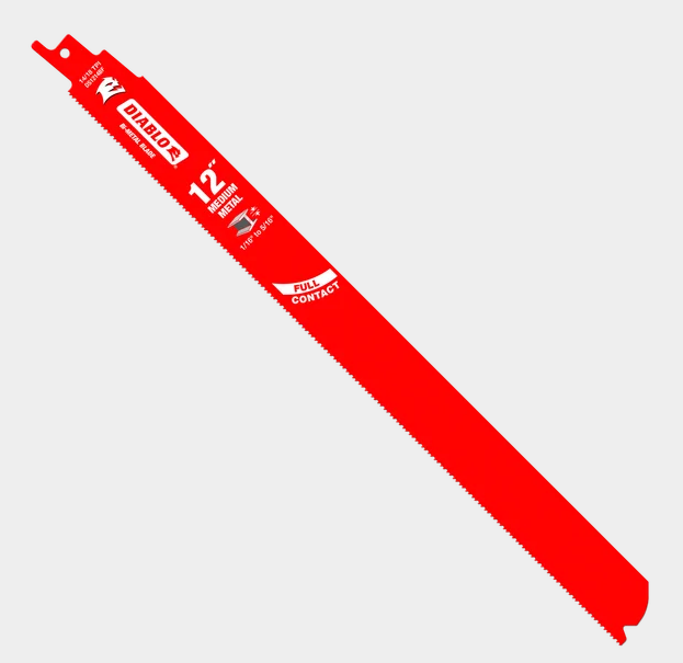 Diablo's Bi-Metal Reciprocating Saw Blades for Medium Metal with Full Contact Arched Design are specifically designed for maximum performance in metal cutting applications ranging fronm 1/16" to 5/16" thick. The blade’s Full Contact Arched Design with ultra hardened cutting edge provides faster cuts in fewer passes, resulting in less heat buildup and up to 5X longer cutting life compared to standard bi-metal blades. A dual-tooth design features a double tooth configuration with small gullets for faster material removal and enhanced durability. An oversized blade body helps stabilize the blade for les chatter and vibration during crucial cuts. Diablo's Perma-SHIELD non-stick coating protects each blade from heat buildup, preventing gumming and corrosion.