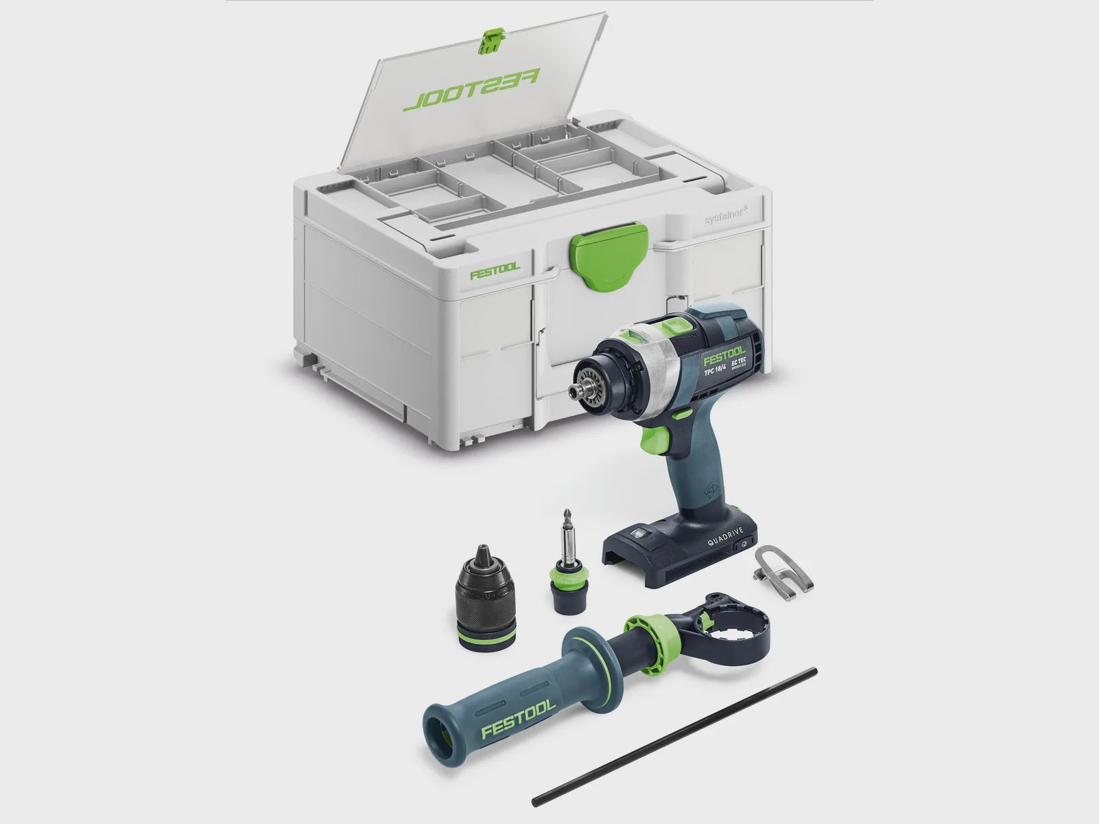 The large number of attachments, combined with perfectly matched accessories, makes the QUADRIVE an unrivaled hammer drill for a wide range of uses. Maintain control with the intelligent Kickbackstop, which helps minimize the risk of the drill twisting out of your hand. We are confident that this is the best drill Festool has ever built!