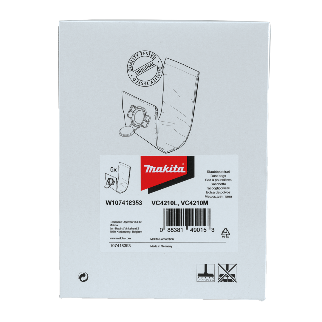 The Makita@ Fleece Filter Bag is designed for use with the Makita@ 11 Gallon Wet/Dry HEPA Filter Dust Extractor/Vacuum (VC4210, sold separately) to capture dust and debris. The bag features a fleece design for added durability. Like a first-stage pre-filter, the fleece filter bag captures larger particles and extends the life of the main flat filter. It installs quickly and easily for added user convenience.