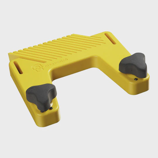The Magswitch woodworking featherboard table is perfect for vertical and right-side applications. Push the flexible fingers against the workpiece and twist each knob to turn on and off 150 pounds of magnetic holding force